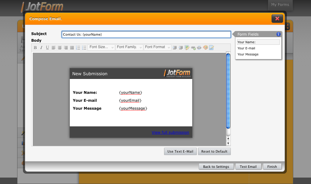 Next, enter email contents. I can use any form answer on the subject or body of the message. Also note that I have total control over the design. I can replace the JotForm logo with my own logo or just remove it.
